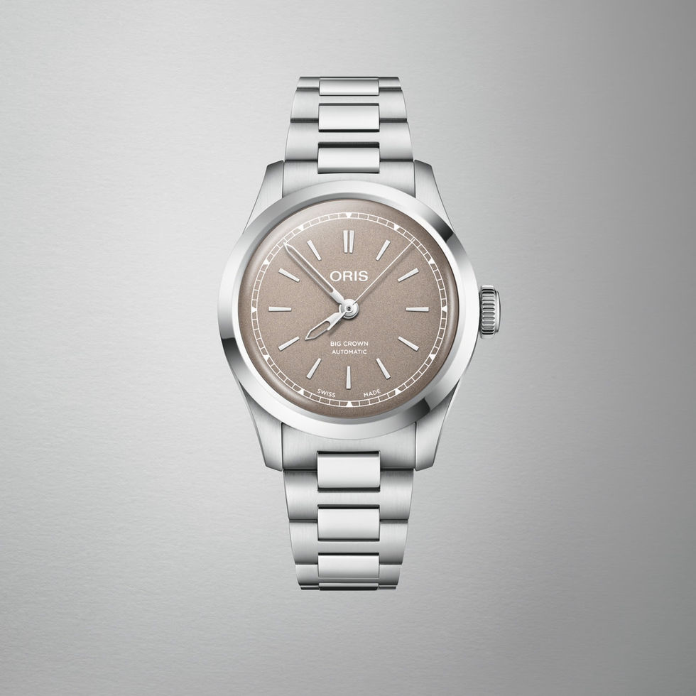 Damenarmbanduhr Oris Big Crown, Edelstahl 316L Ø 34mm, Saphirglas, Automatik Oris 531 - ETA 2671, Zifferblatt braun mit Indexen, Edelstahlarmband 316L, Faltschliesse, Wasserdicht 50m