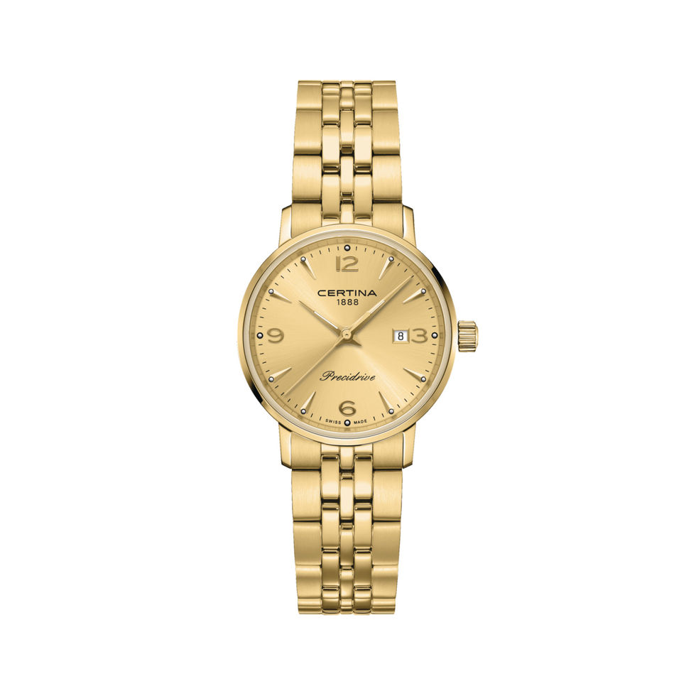 Damenarmbanduhr Certina DS Caimano, Edelstahl 316L mit gelber PVD-Beschichtung Ø 28mm, Höhe 6.90mm, Saphirglas, Quarz ETA F03.412 Precidrive, Zifferblatt gelb mit gelben arabischen Ziffern, Edelstahlarmband 316L mit gelber PVD-Beschichtung, Doppelfaltschliesse, Datum 3H, Wasserdicht 100m