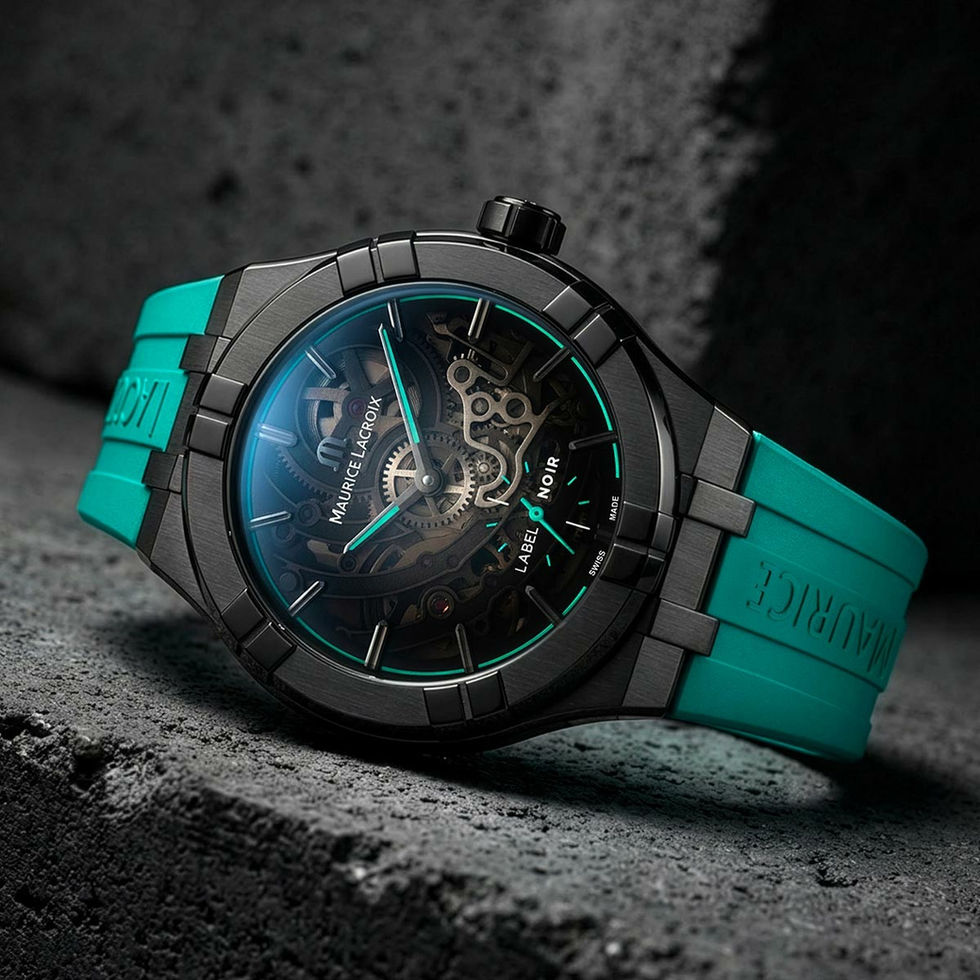Herrenarmbanduhr Maurice Lacroix Aikon Skeleton Label Noir Limited Edition (100 Stücke Weltweit), Edelstahl 316L mit schwarzer DLC-Beschichtung Ø 45mm, Höhe 12.00mm, Saphirglas, Automatik Manufakturwerk ML234-1, transparentes Saphir-Zifferblatt schwarz, Kautschukarmband türkis mit Dornschliesse, Zusatzlederarmband hellgrau mit Doppelfaltschliesse, kleine Sekunde 6H, Wasserdicht 100m